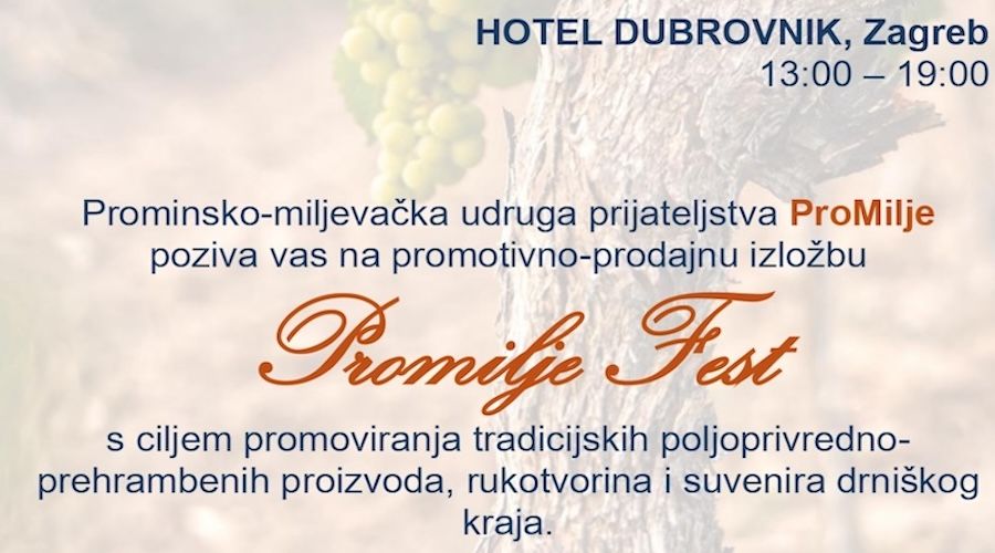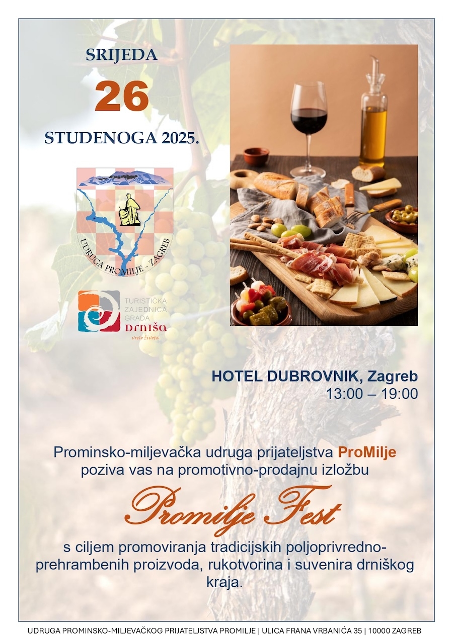 Udruga prominsko miljevačkog prijateljstva – Promilje i turistička zajednica Grada Drniša organiziraju drugi po redu “PromiljeFest”, festival tradicijskih i poljoprivredno prehrambenih proizvoda Promine, Miljevaca i Drniša koji će se održati u Zagrebu 26. studenoga 2025. godine u Hotelu Dubrovnik, Ljudevita Gaja 1 s početkom u 13:00 sati.