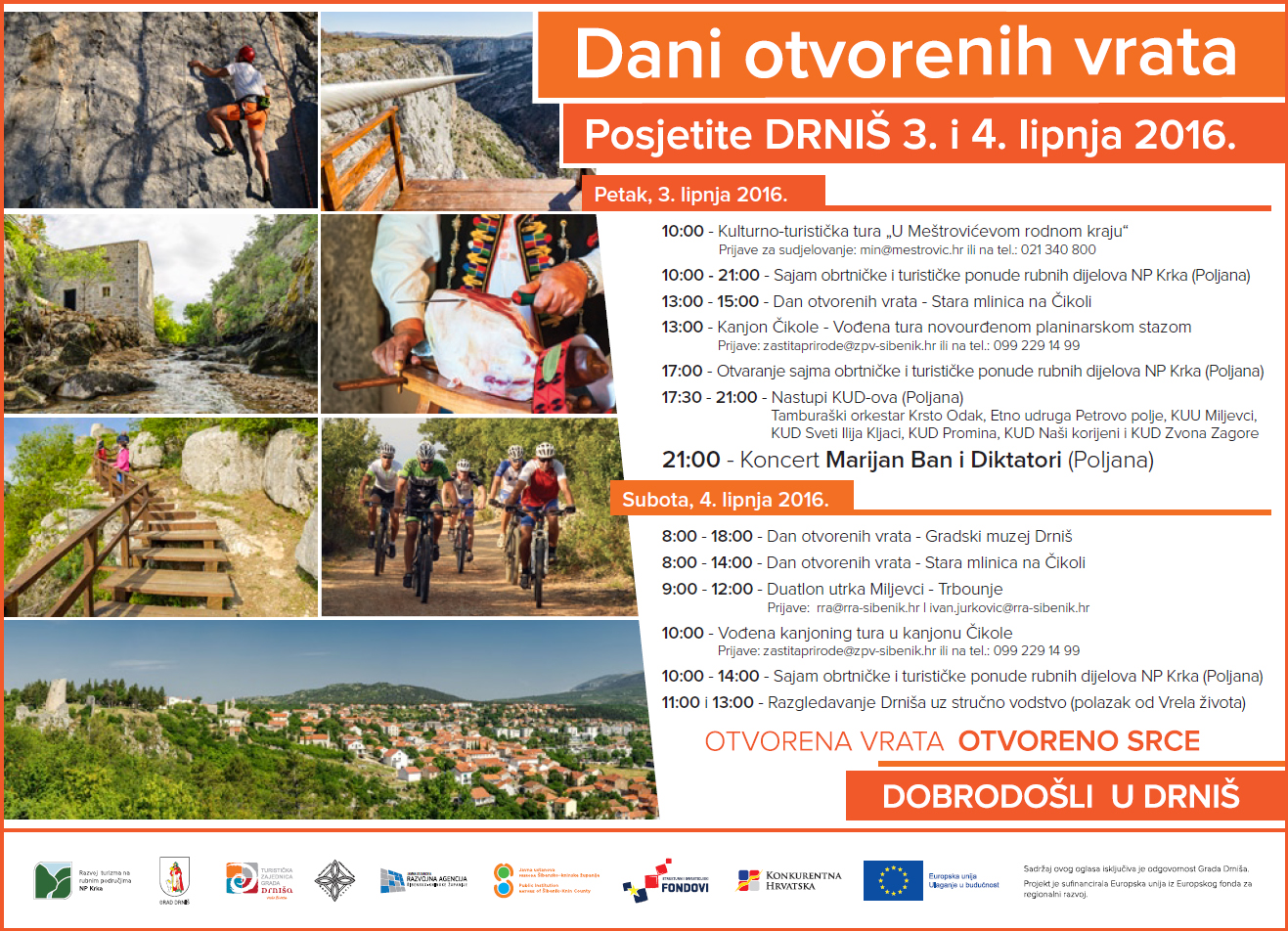 U kanjonu rijeke Čikole uređene su atrakcije aktivnog turizma, planinarske staze i zip line. U Drnišu je rekonstruirana Stara mlinica iz 15. stoljeća koja će na manifestaciji „Drniš – Dani otvorenih vrata“ biti predstavljena široj javnosti. „Na drniškoj Poljani organiziramo Sajam obrtničke i turističke ponude na kojem će svoju ponudu predstaviti više od 40 izlagača, a riječ je većinom o obiteljsko – poljoprivrednim gospodarstvima, domaćim radinostima i obrtnicima.“, najavila je projektna menadžerica Ivana Sučić, pročelnica Upravnog odjela za gospodarstvo, financije i društvene djelatnosti. Uz Sajam organizira se i zabavni program, nastupit će KUD-ovi s drniškog područja, a u večernjim satima veliki koncert održat će pop-rock legenda Marjan Ban s pratećim bendom Diktatori.